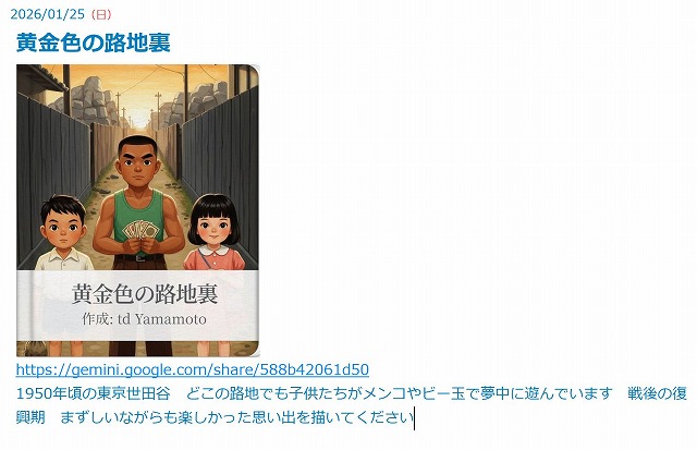 2.作ってみたい絵本のストーリを選び コピーする 3.コピーしたものを日記ソフトに貼り付け 自分の希望する項目を編集する 4.編集出来たものを コピーして Geminiに相談 と記載されているところに貼り付け Enterで作成が始まる 5.作品例 |