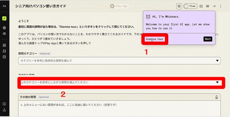 1.英語の説明が出ます クリックしたら消えます 2.質問を選択します 該当する質問が無い場合は下方のその他の質問の欄に記入ください |
