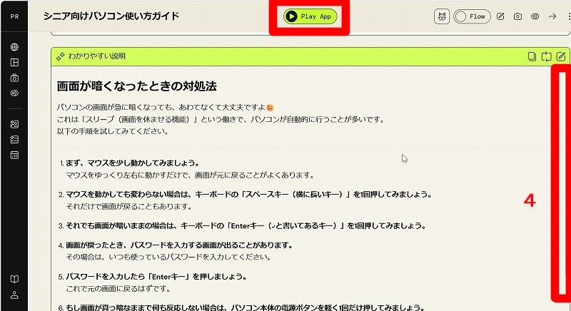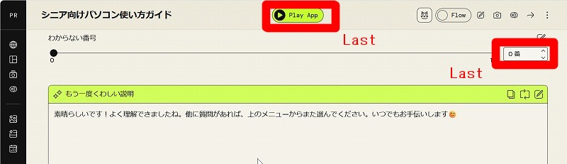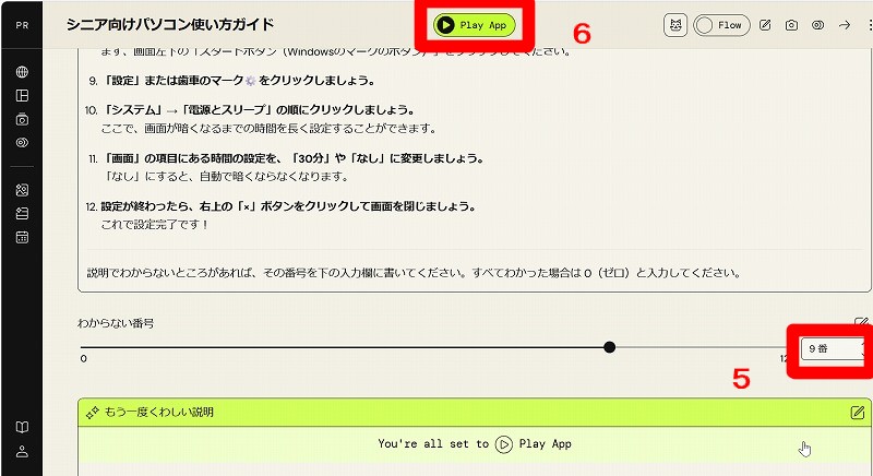 | 説明を読んで、どうしたらいいかわからなかったり 書いている意味がわからなかったら 5.箇条書きの番号をここに入れて(黒い●を動かしても 数字を直接入れても いいです) 6.そしてまた ここをクリックしましょう 編集作業が始まって 終わったら 更に下を見ましょう さらにかみ砕いた説明が表示されます 1ケ所だけでなく他の箇所も聞けますので 5のところに聞きたい箇所の番号を入れ playをクリックしますと下に説明がなされます |